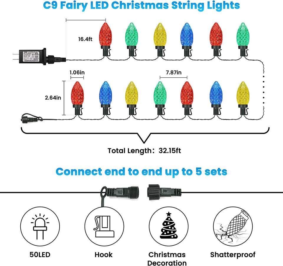- 连接方式:灯串长度为33英尺(约10米),每串包含50颗LED灯(C7/C9样式),可通过灯头(E12/E17底座)直接接入电源或与其他灯串串联使用。