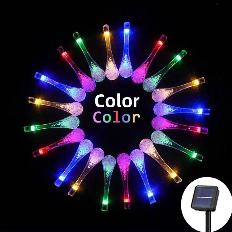 该产品的核心特点包括:① 以水滴为灵感设计,造型独特(如仙女花环);② 采用聚氯乙烯(PVC)材质,轻量化(0.3kg)且耐用;③ IP44防护等级,可抵御雨水和灰尘,适合户外使用;④ CE认证,符合国际安全与质量标准;⑤ 太阳能供电,输入电压≤36伏,节能环保;⑥ 显色指数(RA)70,能真实还原物体颜色;⑦ 5000K日光色温,光线柔和自然。