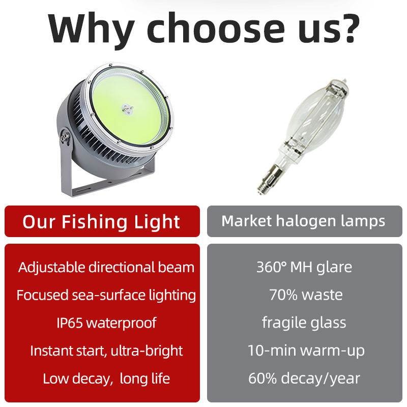 使用时需根据渔船或船舶的照明需求,将灯具安装在甲板、船舷或水下作业区域。输入电压范围为165-265V,兼容12V/24V供电系统,无需调光功能。光线颜色可选绿色(主推型号)或定制,建议根据目标鱼类的趋光性选择颜色(如鱿鱼对绿色敏感)。