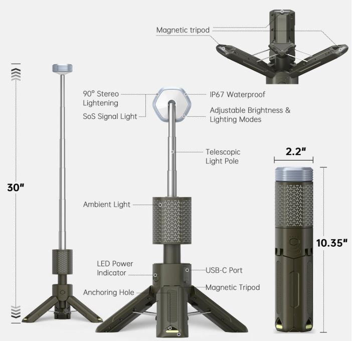 IP67防水野营灯、高流明户外灯、长续航露营灯、宽温区工作灯具、铝合金灯体结构
