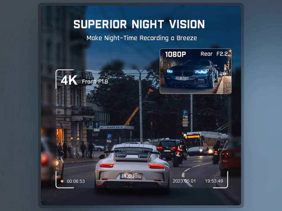 - 画质表现:前置4K分辨率搭配F1.8大光圈+Sony335传感器,白天可清晰拍摄前方车辆车牌、路牌文字,细节丰富(如远处交通信号灯颜色、行人衣物纹理);F1.8光圈进光量充足,配合增强型夜视,夜间低光环境下(如无路灯路段)可避免画面过暗,车牌识别率优于F2.0及以上光圈机型。