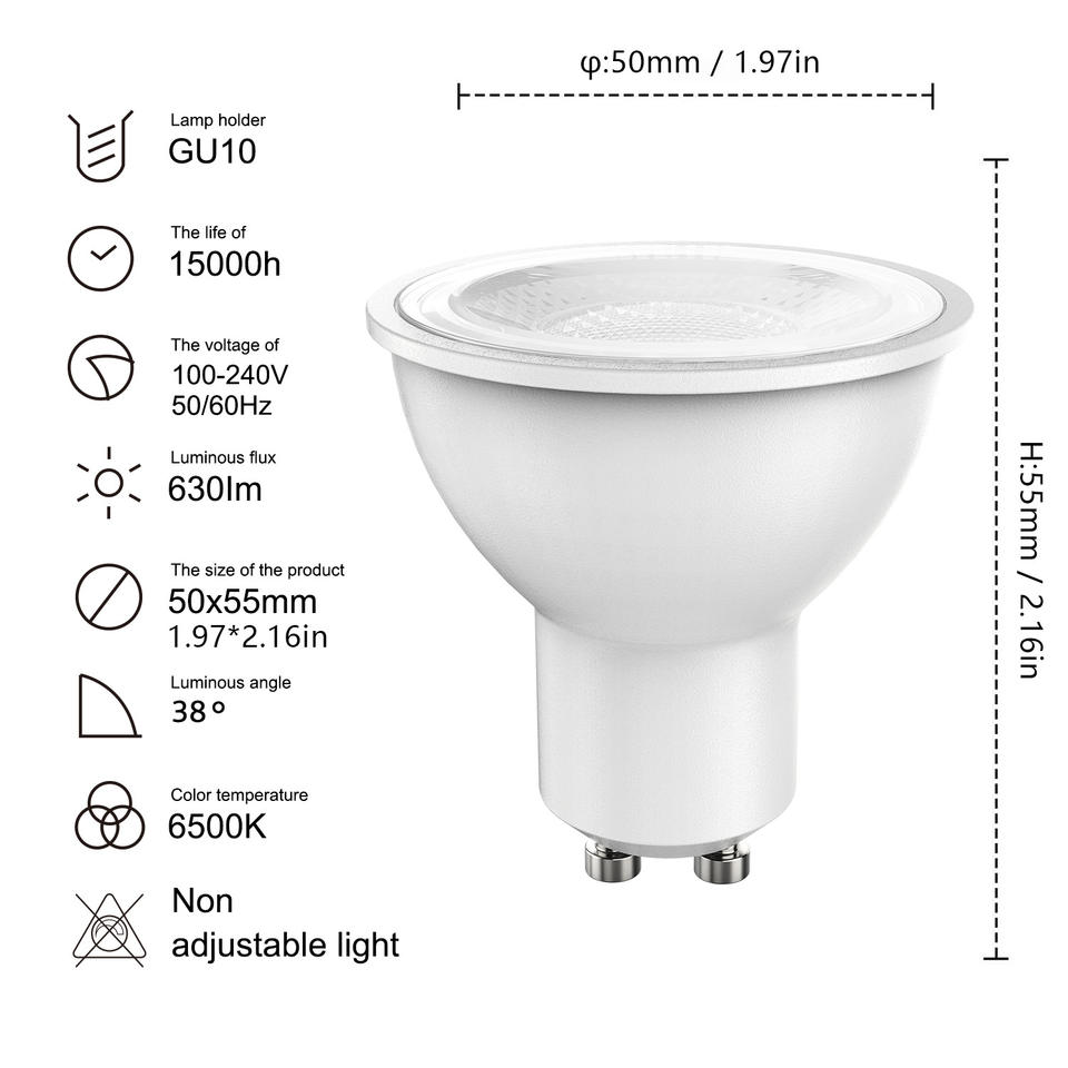 直径50mm(1.97in),高度50mm-55mm(1.97in-2.16in),具体: - GU10(120°平盖/38°透镜):50X55mm - MR16(120°平盖/38°透镜):50X50mm |