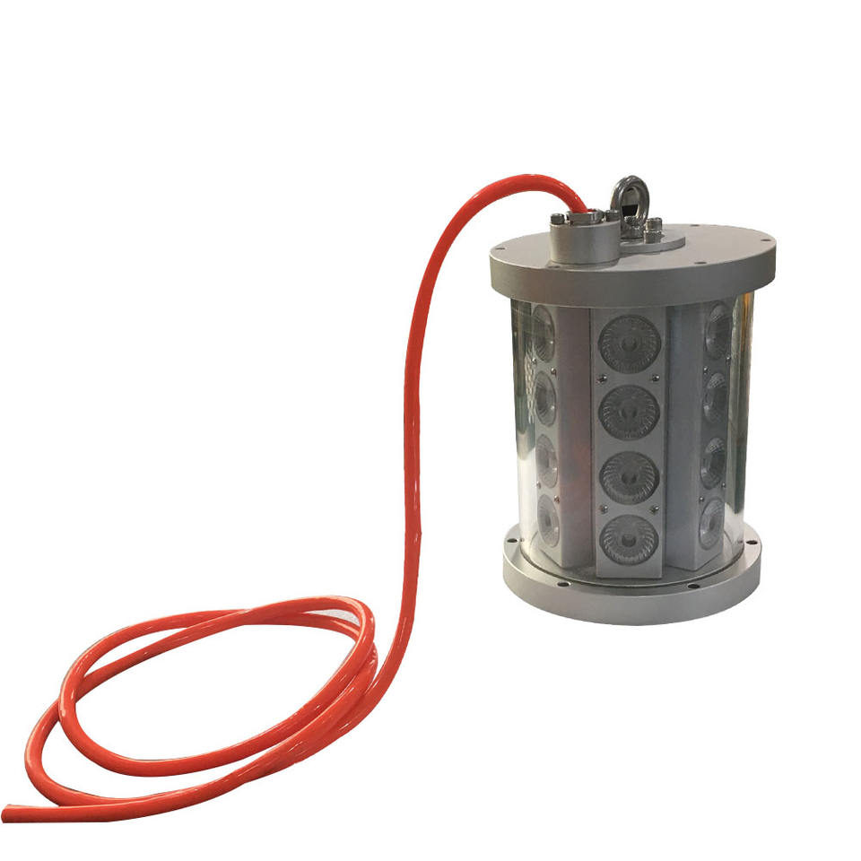绿色LED灯在光谱中波长较短,在水中穿透性强,不易散射。浮游生物会被绿光吸引游向水面,虾、鱿鱼等饵鱼追逐浮游生物,进而吸引掠食性目标鱼靠近,形成食物链反应,将鱼引至船舶附近。
